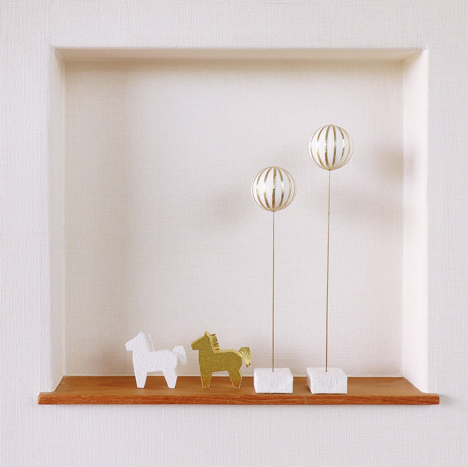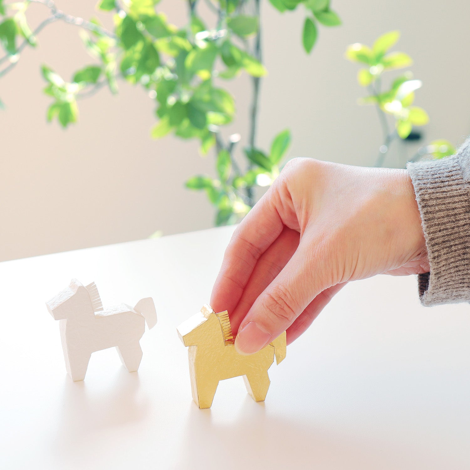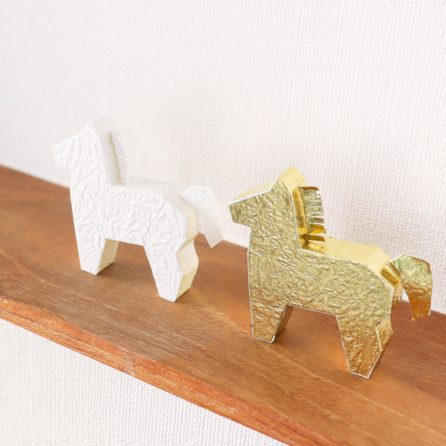 5cmほどの小さな馬をシンプルで立体的なシルエットにした置きかざりです。光沢のある白、華やかな輝きのある金の2色をセットにしました。