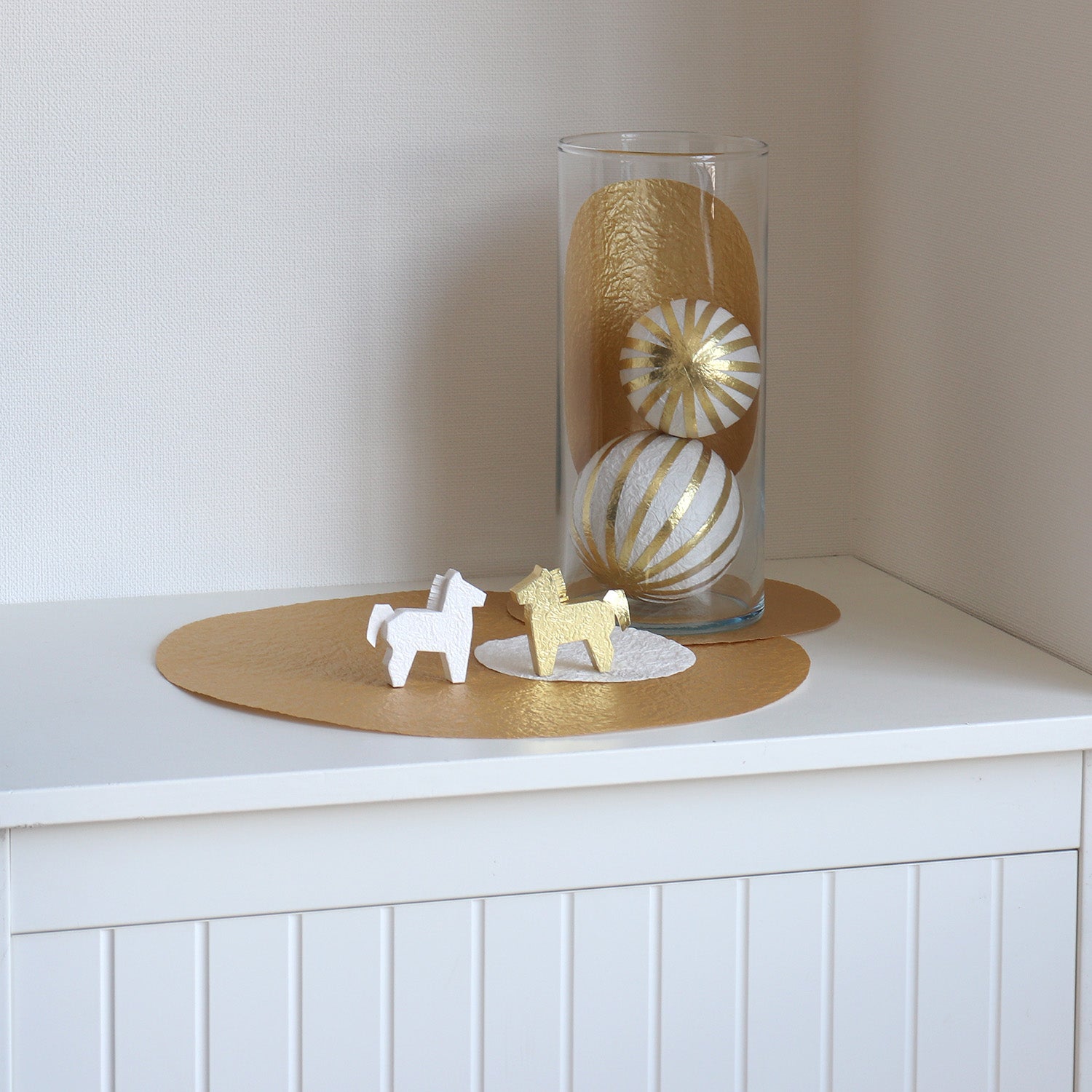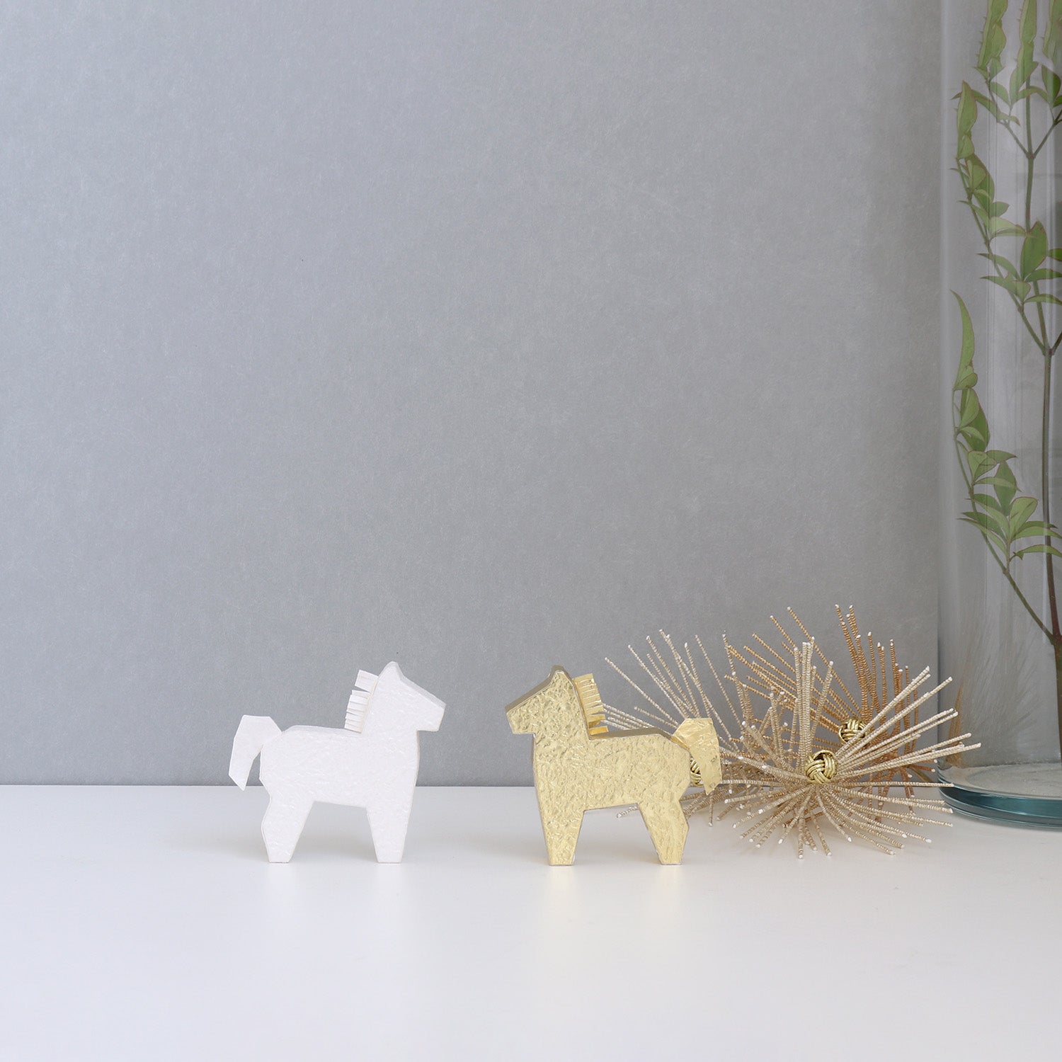 5cmほどの小さな馬をシンプルで立体的なシルエットにした置きかざりです。光沢のある白、華やかな輝きのある金の2色をセットにしました。