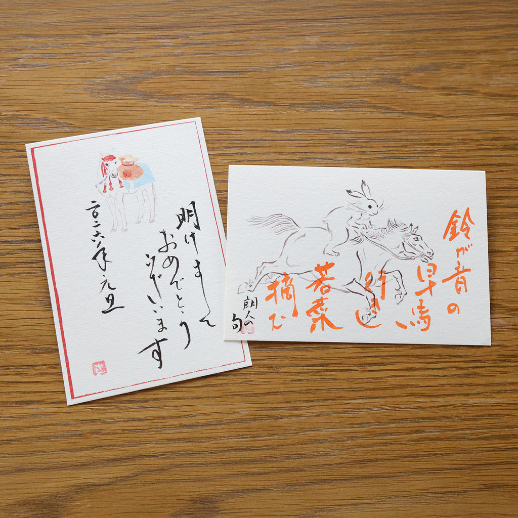 「日本最古の漫画」と称される国宝絵巻物「鳥獣人物戯画(鳥獣戯画)」を模した、うまとうさぎの年賀はがき2枚セットです。