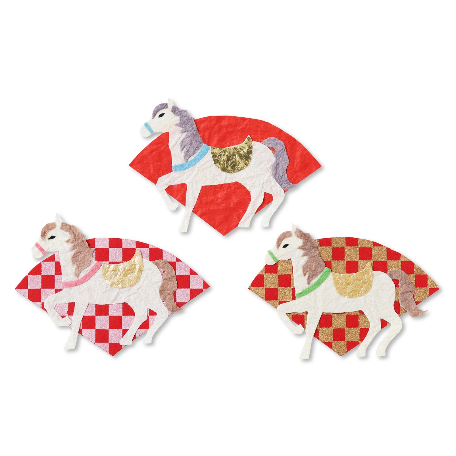 馬の本体、鞍など、それぞれのパーツごとの切り絵を貼り合せていて、約5.7cmの小ぶりなサイズでもしっかりとした存在感があります。色柄違い3枚のセットです。