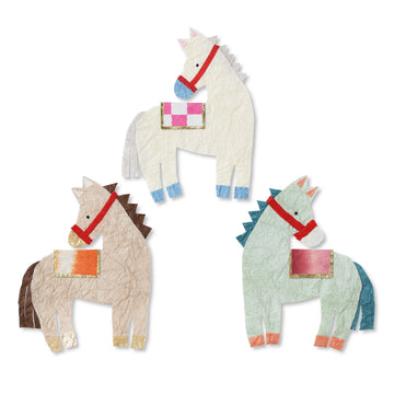 それぞれのパーツごとの切り絵を貼り合せていて、約4cmの小ぶりなサイズでもしっかりとした存在感があります。穏やかな表情をした馬を色柄違いで3枚セットにしました。