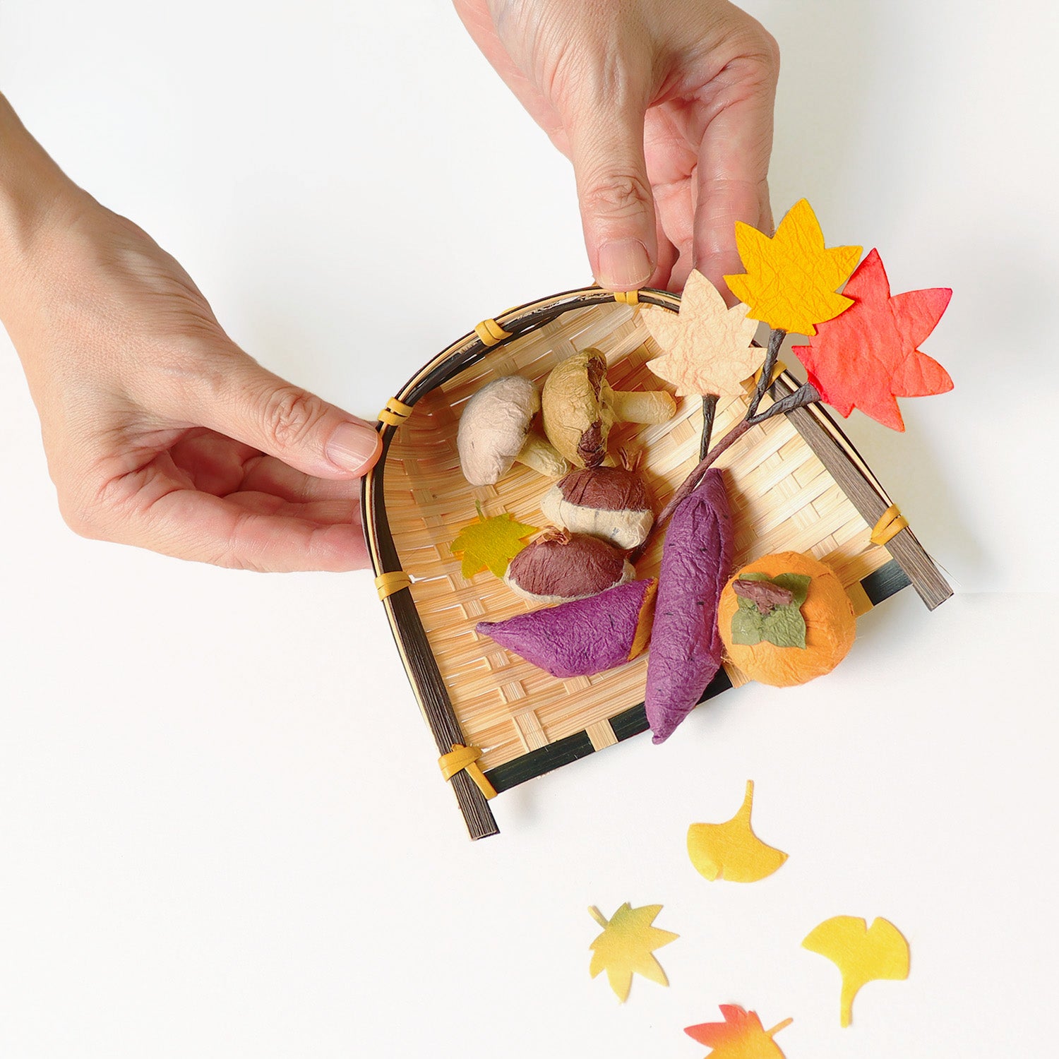 収穫した秋の味覚を竹箕に乗せて、秋の実りを楽しみます。和紙でつくった柿、きのこ、栗、さつまいも。もみじを一枝そえて、はらりと落ち葉を散らします。「お月見だんご」や「和紙 すすき」と合わせてお月見のお供え物に、もみじ飾りと合わせて秋の室礼にご利用ください。【サイズ】竹箕:幅 12 cm × 奥行 10 cm × 高さ 4 cm
