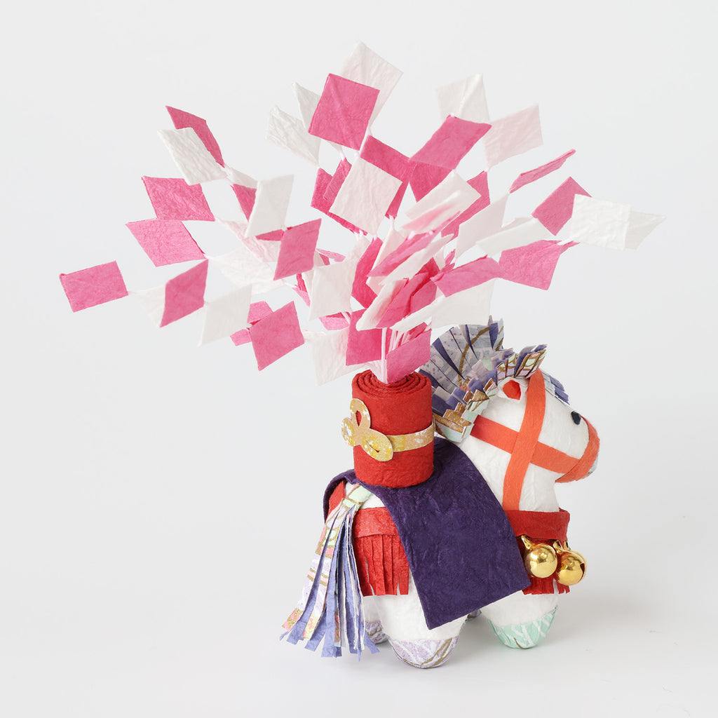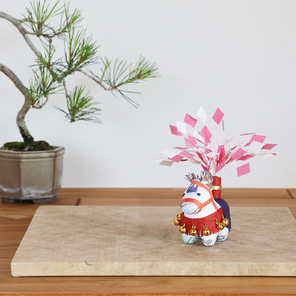 五穀豊穣や家内安全を願って行なわれる花馬祭り。和紙で作った紅白の花がゆらゆらと揺れて福を呼び込みます。心穏やかに新年を迎えられますように。「ミニ盆栽 松」や「金屏風 小」「黒塗り台 横長」と組み合わせれば、一段華やかな印象になります。※紅白の花の芯は和紙の「こより」で出来ています。やさしく広げて飾ってください。※一つひとつ手作りのため、色柄・風合い・仕様などが写真と若干異なる場合がございます。