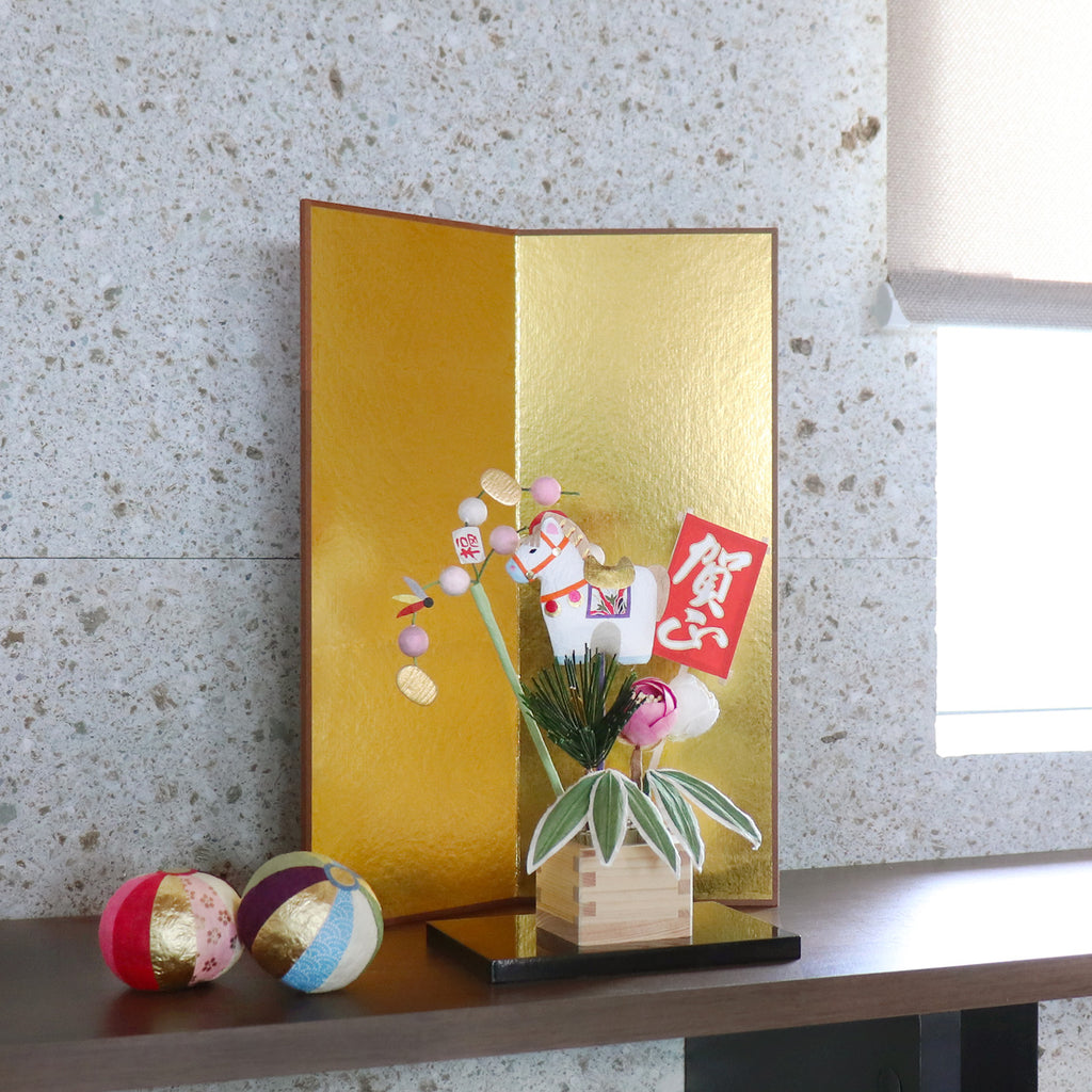 お部屋を華やかに彩る金屏風です。 背の高いお飾りや置物などのバックに最適の仕様となっております。 お正月のお飾りと一緒に飾ることで、おめでたいお正月を華やかに演出することができます。
